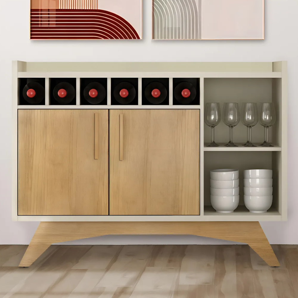 Estrutura Híbrida MDF/MDP: Fabricado com um mix de fibras de alta qualidade, o buffet oferece a estabilidade necessária para suportar objetos decorativos pesados, bandejas de bebidas ou aparelhos de som.