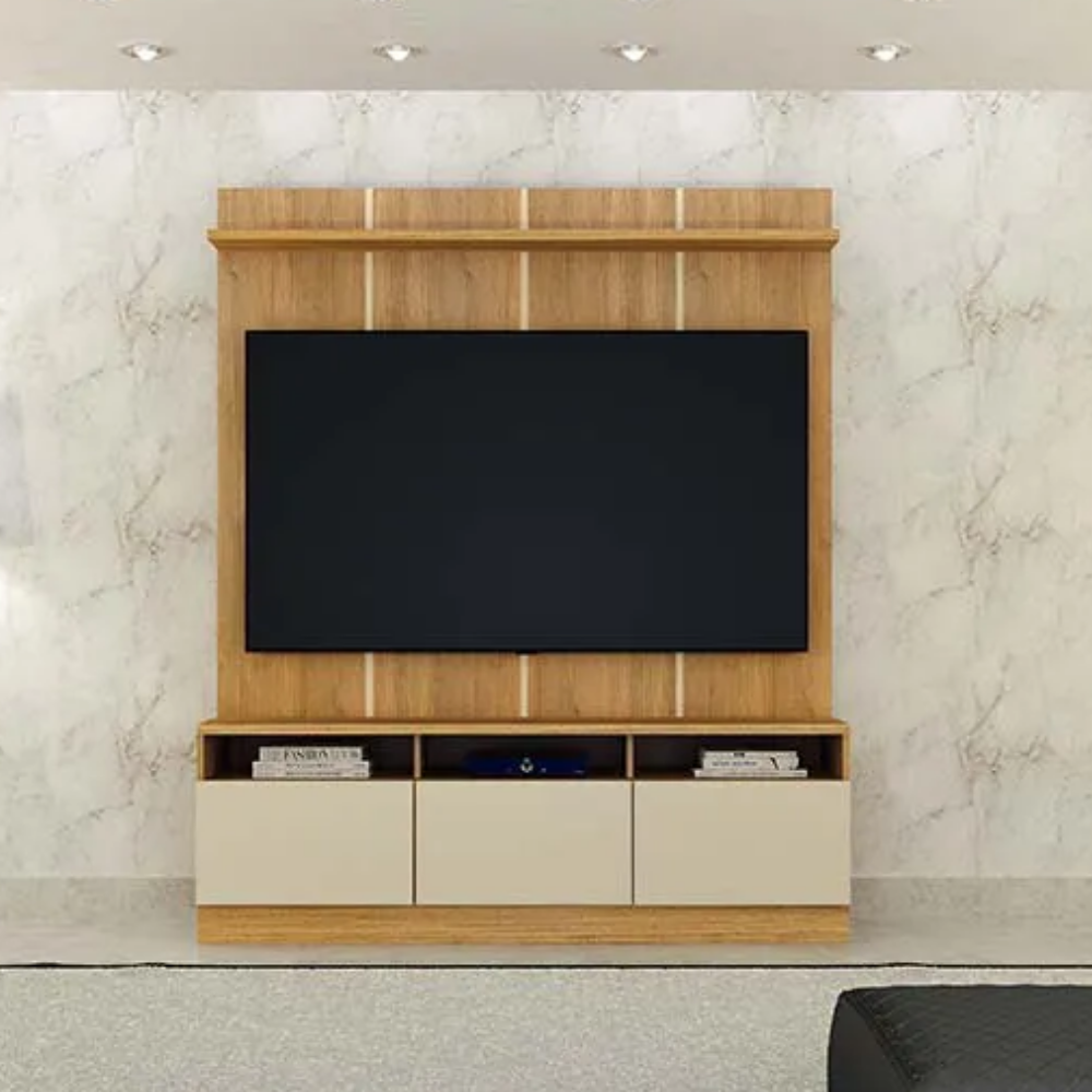Suporte para Telas Grandes: Com 160 cm de largura, este painel acomoda perfeitamente televisores de até 65 polegadas, garantindo que sua TV seja a protagonista do ambiente com total estabilidade.