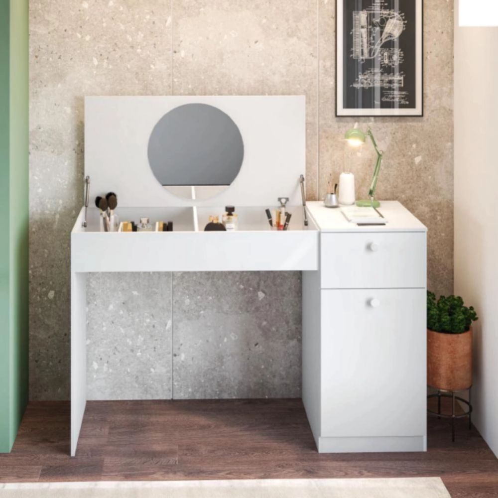 Organização Especializada: Equipada com 1 porta e 1 gaveta de amplo espaço interno, ela permite que você armazene desde paletas de maquiagem e perfumes até cadernos e eletrônicos, mantendo tudo ao alcance das mãos.