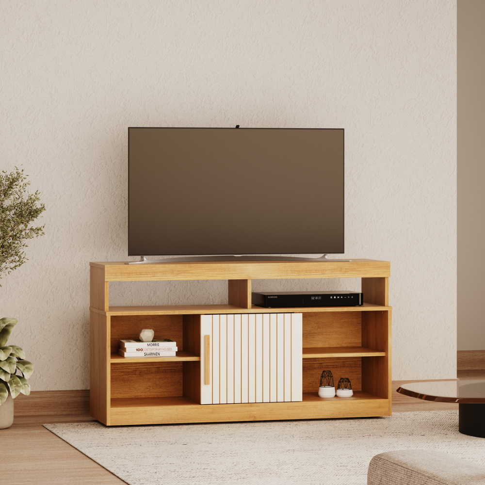 Aproveitamento de Tampo: Espaço planejado para acomodar TVs de forma segura, com área útil otimizada para aparelhos com pé central ou lateral.