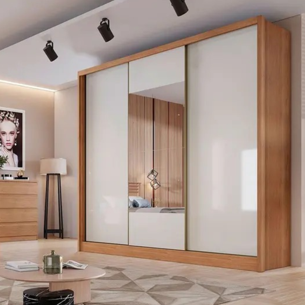 Sistema de 3 Portas Corrediças: Diferente dos modelos padrão, a divisão em três portas oferece maior flexibilidade de acesso e um design simétrico elegante, ideal para otimizar a circulação no dormitório.