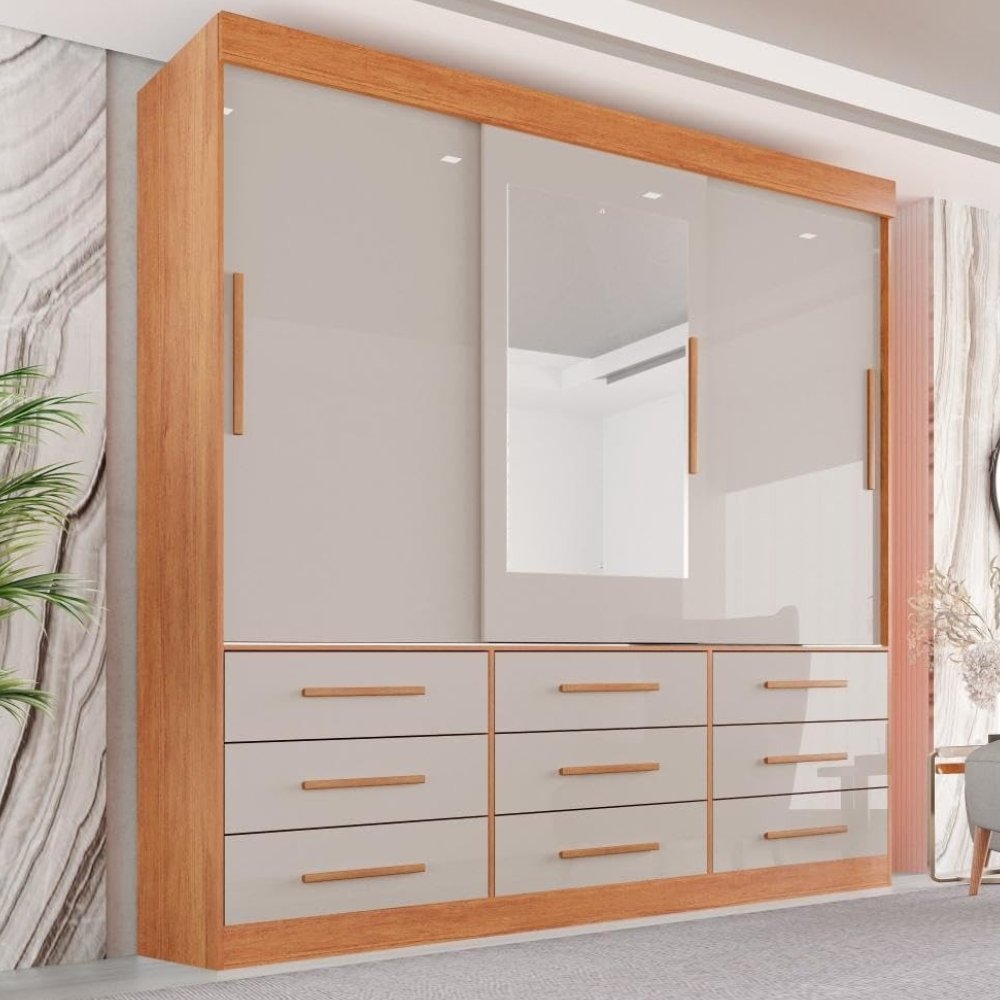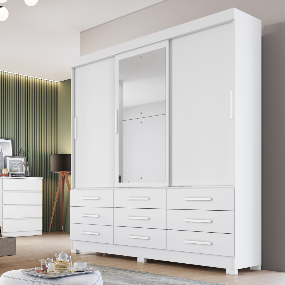 Campeão em Compartimentos: Se você busca um móvel onde cada acessório tenha seu lugar, as 9 gavetas deste roupeiro oferecem uma capacidade de setorização incomparável.