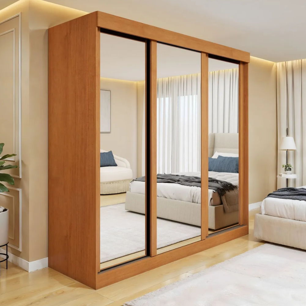 Design 100% Espelhado: Equipado com 03 espelhos retangulares de tamanhos iguais, cobrindo todas as portas de correr. É funcionalidade e estética em uma única peça.